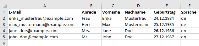 Abonnenten: ImportWahrscheinlich haben Sie bereits eine Liste von Adressen zusammengestellt, die Sie per Newsletter anschreiben möchten. Über das universelle CSV-Dateiformat lassen sich Ihre Adressen aus nahezu jeder Datenbank oder Tabellenkalkulation (z. B. Microsoft Office oder Open Office) exportieren und anschließend in mailworxx importieren. Um die Zuordnung der Spalten (z. B. Vorname, Nachname, E-Mail) beim Import zu erleichtern, sollte die erste Zeile Ihrer CSV-Datei aussagekräftige Spaltenüberschriftten enthalten. Ein Beispiel: