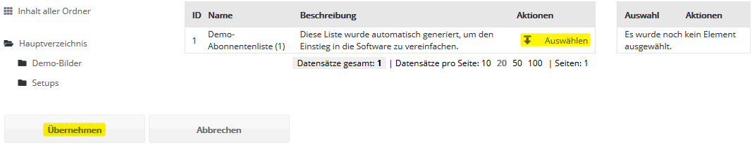 Schritt 3 - AbonnentenlistenWählen Sie nun aus, in welche mailworxx Abonnentenliste ihre CSV-Datei importiert werden soll. Falls Sie zuvor keine eigene Abonnentenliste in mailworxx angelegt haben (siehe Menü Abonnentenlisten), steht zum schnellen Einstieg die leere Abonnentenliste 'Demo-Liste' bereit. Diese Liste wird in der Regel bei der Einrichtung Ihres mailworxx Kontos angelegt und zur Demonstration mit einem Beispiel-Abonnenten befüllt.