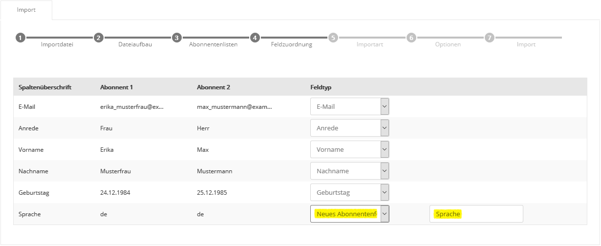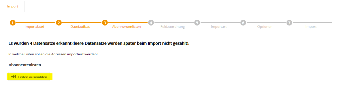 Auch die Auswahl mehrerer Abonnentenlisten ist möglich, falls Sie parallel in mehrere Listen importieren möchten. Klicken Sie nach Auswahl der gewünschten Liste(n) auf 'Übernehmen' und anschließend auf 'Weiter'. Der Name einer Abonnentenliste lässt sich im Menü Abonnentenlisten auch nachträglich jederzeit ändern. Schritt 4 - FeldzuordnungIn Schritt 4 teilen Sie mailworxx mit, welche Spalte (z.B. Vorname, Nachname) Ihrer CSV-Datei in welches mailworxx Abonnentenfeld importiert werden soll. Zum schnellen Einstieg sind typische Abonnentenfelder wie 'E-Mail', 'Anrede', 'Vorname' und 'Nachname' in mailworxx bereits vorhanden.