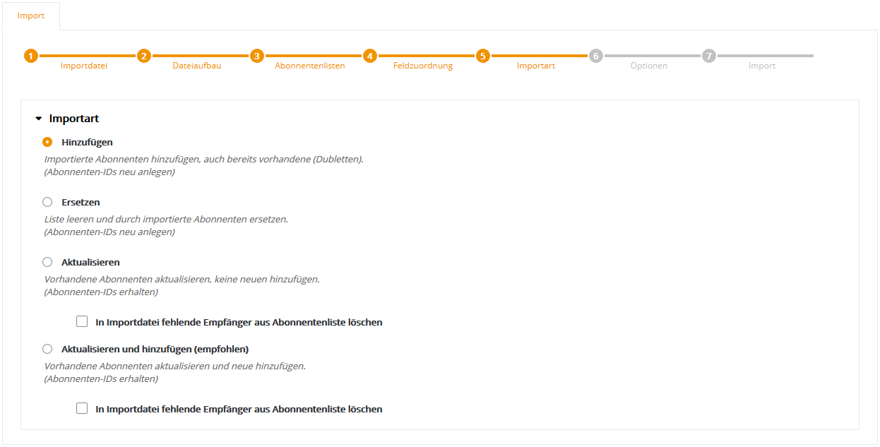 Auf der linken Seite sehen Sie am Beispiel der ersten beiden Abonnenten noch einmal den Inhalt Ihrer CSV-Datei. Auf der rechten Seite wählen Sie bitte den 'Feldtyp', der zum jeweiligen Inhalt passt. Dabei übernimmt mailworxx die Zuordnung automatisch, wenn der Name von CSV-Spaltenüberschrift und mailworxx-Abonnentenfeld übereinstimmt. Wird automatisch kein passendes Abonnentenfeld gefunden, ist der neue Feldinhalt zunächst auf 'nicht importieren' gesetzt. Wählen Sie in dem Fall entweder eines der vorhandenen Felder aus, oder nutzen Sie die Option 'neues Abonnentenfeld', um ein neues Feld anzulegen und ihm einen Namen zu geben. An dieser Stelle erhalten neue Felder grundsätzlich den Typ 'mehrzeiliger Text', siehe auch nachfolgender Tipp. Klicken Sie anschließend auf 'Weiter'. --> Tipp: Idealerweise sollten Sie sich bereits vor dem Import einmalig die Zeit nehmen, im mailworxx Menü 'Abonnentenfelder' alle Felder so anzulegen, dass Feldname und Feldtyp zu Ihren importierten Daten passen. Damit profitieren Sie zukünftig von der automatischen Feld-Zuordnung, was bei wiederkehrenden Importen nicht nur Zeit spart, sondern auch eventuelle Fehler durch unpassende Feldtypen oder die manuelle Feld-Zuordnung verhindert. Schritt 5 - ImportartHier legen Sie fest, wie Ihre neu importierten Daten mit den vorhandenen 'alten' Daten der gewählten mailworxx-Abonnentenliste(n) abgeglichen werden sollen.