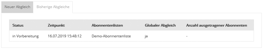 Daraufhin startet mailworxx den Abgleich. Im Reiter 'bisherige Abgleiche' können Sie den Status des Fortschrittes einsehen. Nach Fertigstellung wird Ihnen die Anzahl der ausgetragenen Abonnenten angezeigt. |