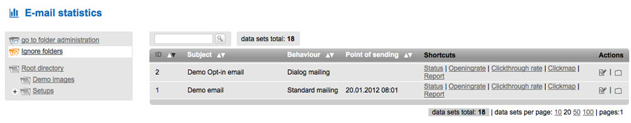 Here you find the statistics of all sent mails. For easier access mailworxx already includes a demo-mail you can view. |