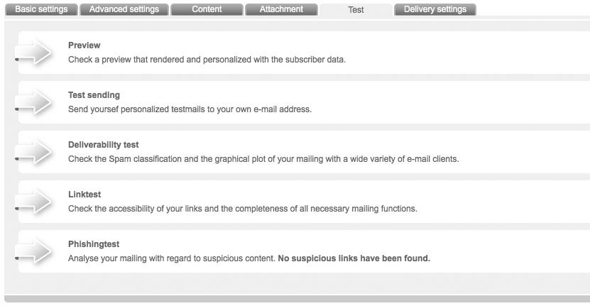 Having finished your newsletter, mailworxx offers you numerous testing possibilities. This helps you to optimize your mailing and achieve maximum success before actual dispatch. You can get to the testing functions by choosing the tab 'Test' in the menu in which you edit your mailing. Following tests are available: |