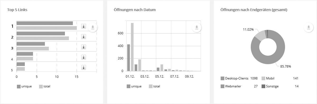 Per Klick auf 'Vollbild' wird die Karte im gesamten Fenster dargestellt. Direkt unter dem Vollbild-Link können Sie per Download-Button die Grafik der Karte in verschiedenen Formaten herunterladen. Hinweis: Obwohl IP-Adressen grundsätzlich nicht an einen bestimmten Ort gebunden sind, lässt sich durch die bekannten IP Adressräume von Internetprovidern, Universitäten und ähnlichen Einrichtungen in vielen Fällen der Standort ermitteln. Da regionale Einwahlknoten häufig einen festen IP-Adresspool besitzen, funktioniert das Verfahren auch bei dynamischer IP-Vergabe. Für die Zuordnung nutzt mailworxx eine regelmäßig aktualisierte lokale Kopie einer Geotargeting-Datenbank, die ein externer Dienstleister zur Verfügung stellt. --> Top 5 Links + Öffnungen nach Datum und EndgerätenWie bei jedem anderen Diagramm lassen sich auch hier per Download-Button (rechte obere Ecke) die angezeigten Daten als Grafik- oder Excel-Datei herunterladen. Einzelne Diagramm-Segmente lassen sich ein- oder ausblenden, indem man auf den entsprechenden Punkt in der Legende klickt, z.B. auf 'Desktop-Clients' im Diagramm 'Öffnungen nach Endgeräten'. Damit werden die übrigen Segmente auf 360° gezoomt und deren Prozentzahlen passen sich der neuen Anordnung an. So lässt sich das Verhältnis beliebiger Segmente direkt vergleichen.