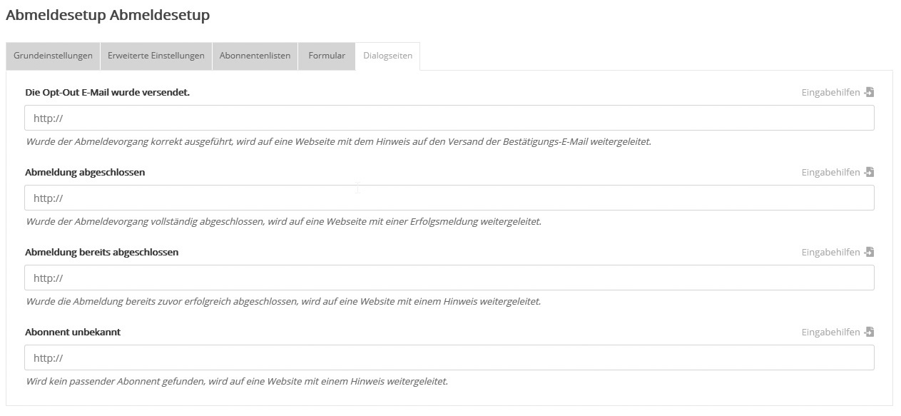 AbonnentenlistenJe nachdem, ob die Abmeldung per Newsletter-Link oder per Website-Formular stattfindet, wird der Abonnent aus folgenden Listen abgemeldet: Variante 1: Abmeldelink im NewsletterFür Standardmails gilt: Zusätzlich zu den auf dem Reiter 'Abonnentenlisten' gewählten Listen findet die Abmeldung auch in den angeschriebenen Listen statt. Für Kampagnen- und Dialogmails gilt dieser Zusatz nicht, da diese nicht an eine bestimmte Liste verschickt werden. Variante 2: Abmeldeformular auf WebsiteDie Abmeldung findet in den unter 'Abonnentenlisten' markierten Listen statt, und wenn vorhanden, dann auch in den direkt im Formular zur Auswahl durch den Nutzer angebotenen Listen (siehe nächster Abschnitt 'Formular'). Beides gleichzeitig ist nicht möglich. Das heißt: Sobald Sie eine Liste im Reiter 'Abonnentenlisten' markiert haben (und damit fest vorgeben), kann sie nicht gleichzeitig im Abmelde-Formular (ab)wählbar sein. Im dem Fall wird sie automatisch aus dem Formular entfernt und umgekehrt. Sonderfall beim Abmeldeformular: Ist keine Liste zur Abmeldung markiert und auch im Formular keine enthalten, dann findet die Abmeldung in allen Listen statt. Damit wird der Abonnent auch aus der 'Abonnentenverwaltung' entfernt. FormularHier erstellt mailworxx automatisch den Quellcode für ein Abmeldeformular, das Sie auf Ihrer Website einbinden können. Den Inhalt des Formulars stellen Sie per Drag&Drop zusammen. Die Bedienung ist identisch zum Anmeldeformular-Editor. Nach Klick auf den Button 'Test des Formulars' wird Ihr neues Abmeldeformular angezeigt und die Funktion lässt sich anhand realer Abmeldungen testen. Geben Sie gültige und ungültige Abonnentendaten ein, um die entsprechenden Textmeldungen bzw. Dialogseiten zu prüfen. Ein während des Tests abgemeldeter Abonnent lässt sich unter 'Abonnenten' -> 'Abmeldungen' wiederherstellen. --> Hinweis zu Abmeldungen beim Testversand: Solange es sich um den Testversand eines Mailings handelt, findet bei Klick auf den Abmeldelink keine Abmeldung statt. Stattdessen wird lediglich eine Bestätigung angezeigt, ob das Abmeldesetup korrekt eingerichtet wurde. Erst beim späteren realen Versand findet eine tatsächliche Abmeldung statt und es erscheint die von Ihnen eingestellte Dialogseite, die Sie unter 'Formular testen' jederzeit testen können. Dialogseiten |